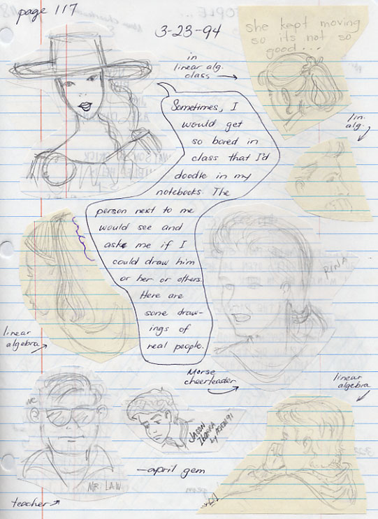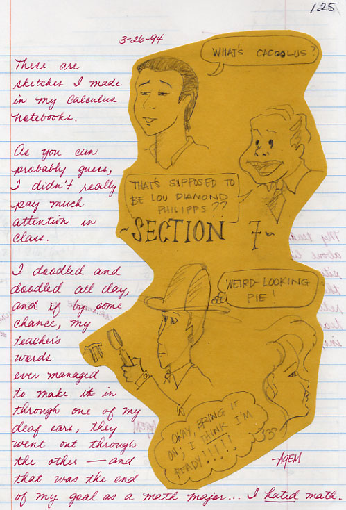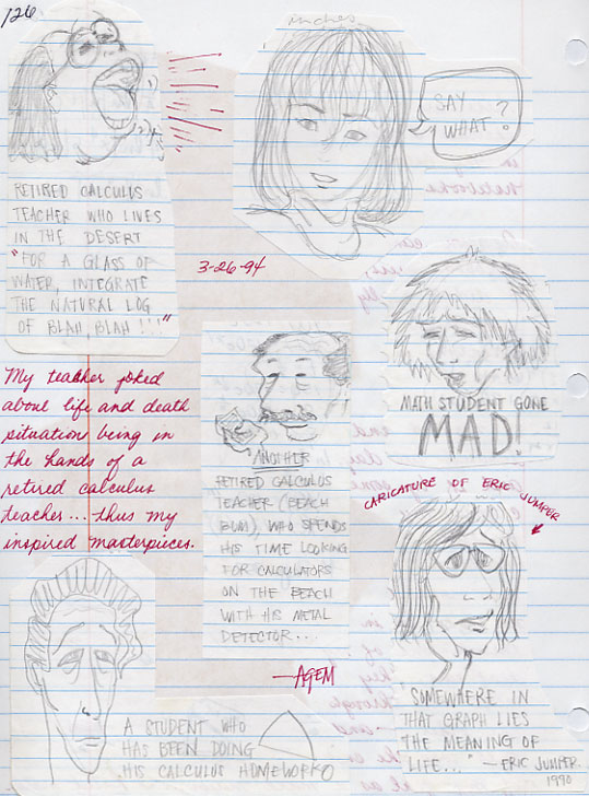 Warning: they're not that good. After all, they're only doodles done during bored and furtive moments. I felt guilty about them for years until I visited the Dr. Seuss Collections in the library of my alma mater, UCSD. It turns out that he used to doodle in his math notebooks, too, which is kind of neat since he's one of my heroes.